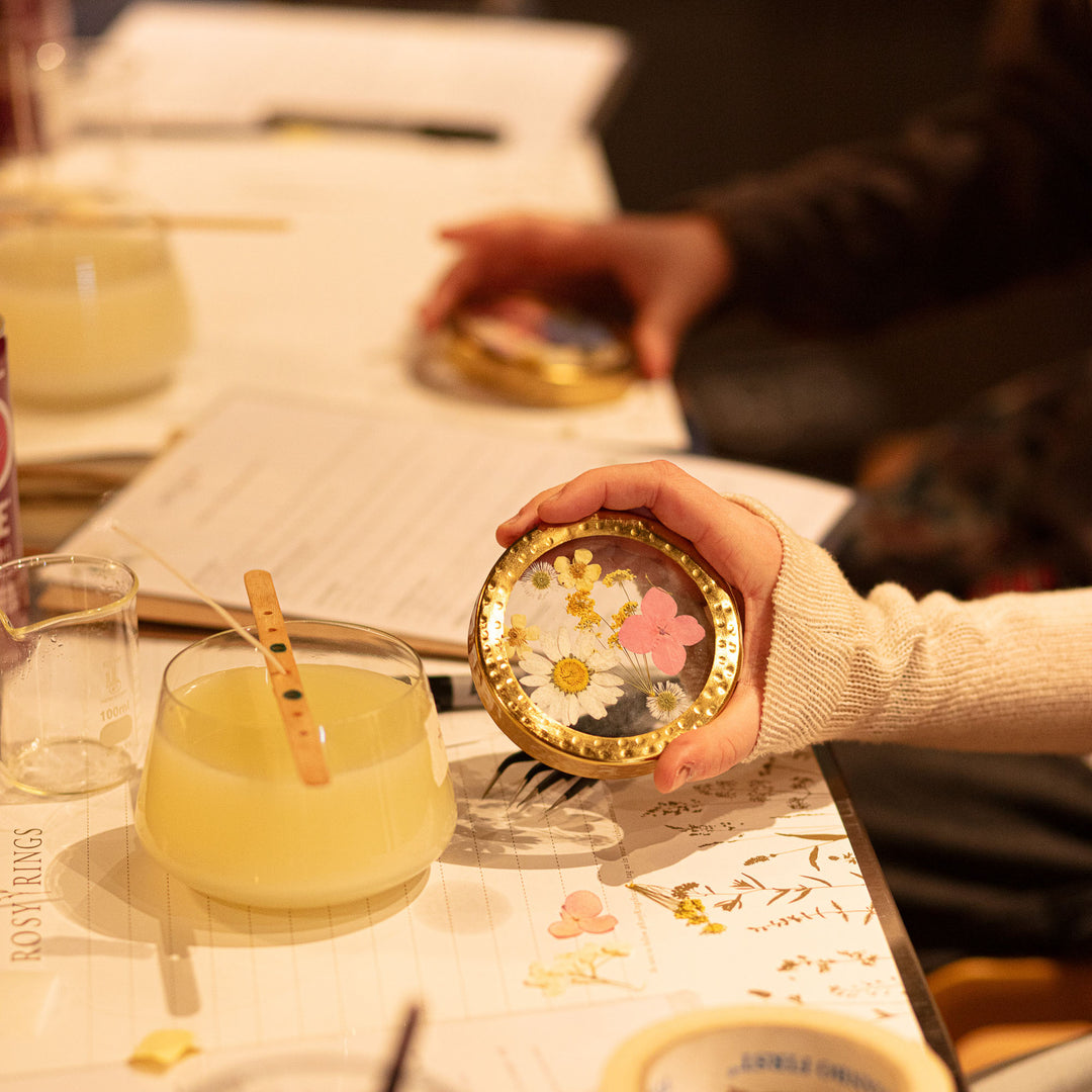 Party guests can then choose from a variety of dried botanicals to create a custom lid for their custom candle!